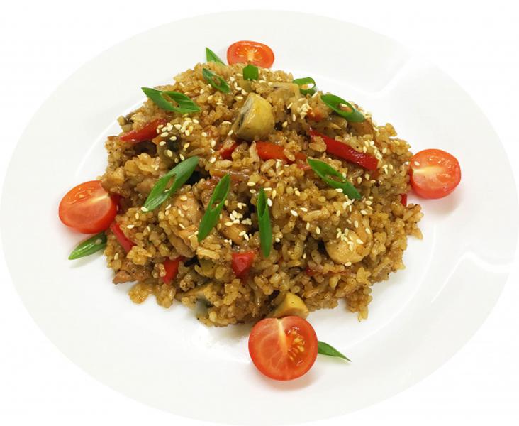 Состав: Рис, креветка тигровая, перец болгарский, лук, томат, грибы шампиньоны, соус, масло кунжутное.
