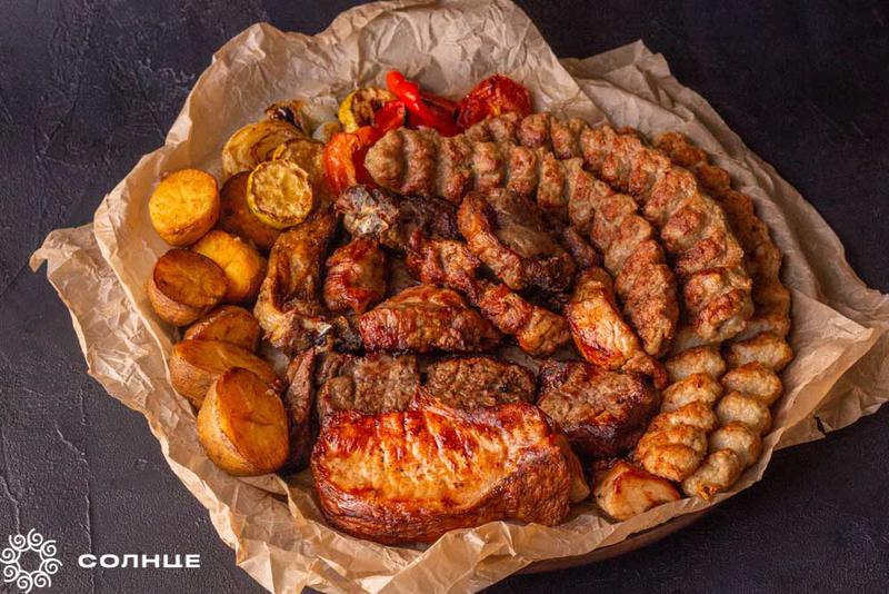 Состав: Шашлык из говядины - 300 гр Баранина на ребрышках - 300 гр Овощи-гриль - 600 гр Картошка на мангале без сала - 700 гр Шашлык из свиной шеи - 300 гр Корейка на кости - 300 гр Люля-кебаб из курицы - 400 гр Люля - кебаб из говядины - 400 гр Лук маринованный - 500 гр