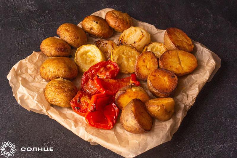 Состав: Шампиньоны на мангале 150 гр. Картошка на мангале 350 гр. Овощи гриль 300 гр. Лук маринованный 50 гр