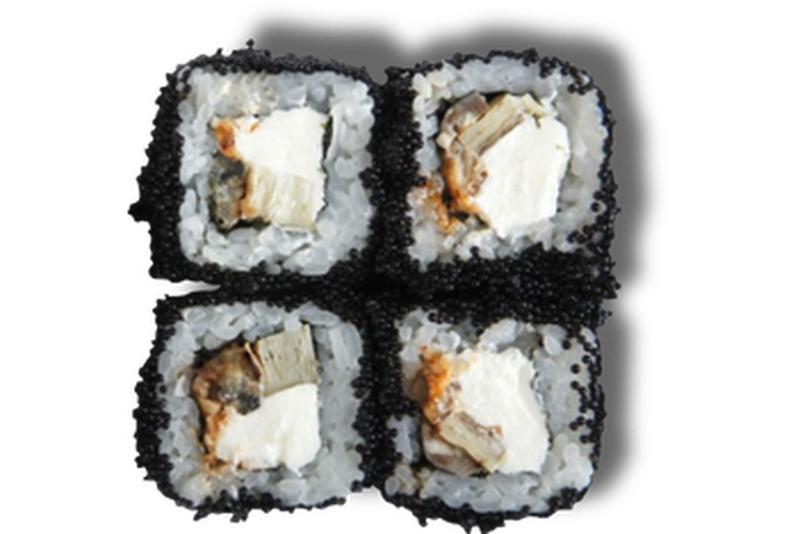 Состав: Сливочный сыр, угорь, икра тобико черная, японский омлет, острый соус.