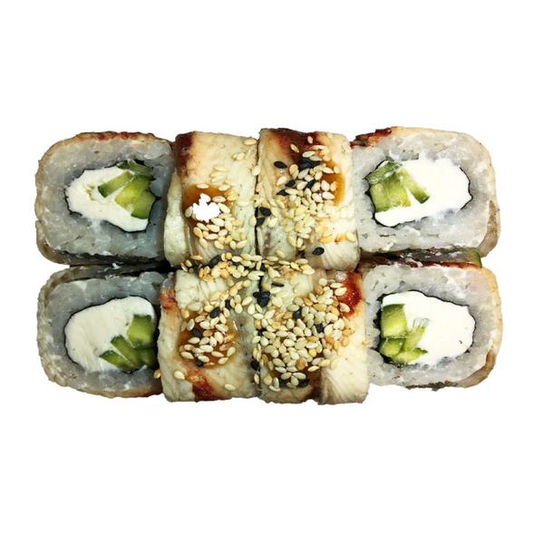 Состав: Суши рис, нори, сливочный сыр, угорь, огурец, лосось